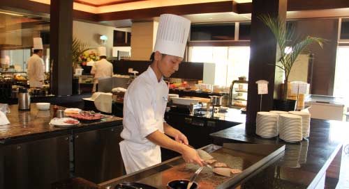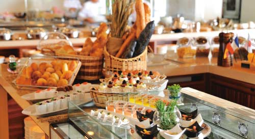 天然ビーチをのぞむオールデイダイニング「コラーロ」では、シェフが腕によりをかけて作った和洋中の料理の他に開業時からのレシピを受け継ぐホテルメイドのカレーはぜひ味わってほしい一品。メイン以外にもおすすめの自家製ケーキは、毎朝厨房で焼き上げ、できたてのおいしさを味わえる。季節のサラダやスイーツなど、ホテル自慢の料理にも舌鼓。