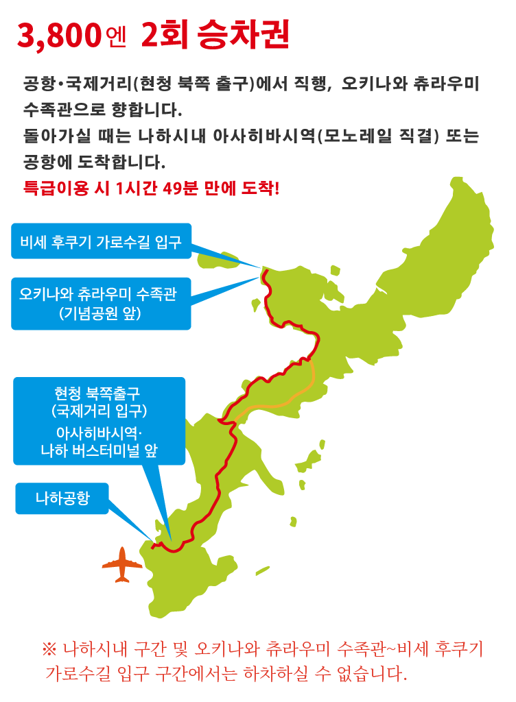 - ※ 나하 시내 구간에서의 승하차 및 오키나와 츄라우미 수족관↔︎비세 후쿠기 가로수길 입구 사이의 승하차는 불가능합니다.