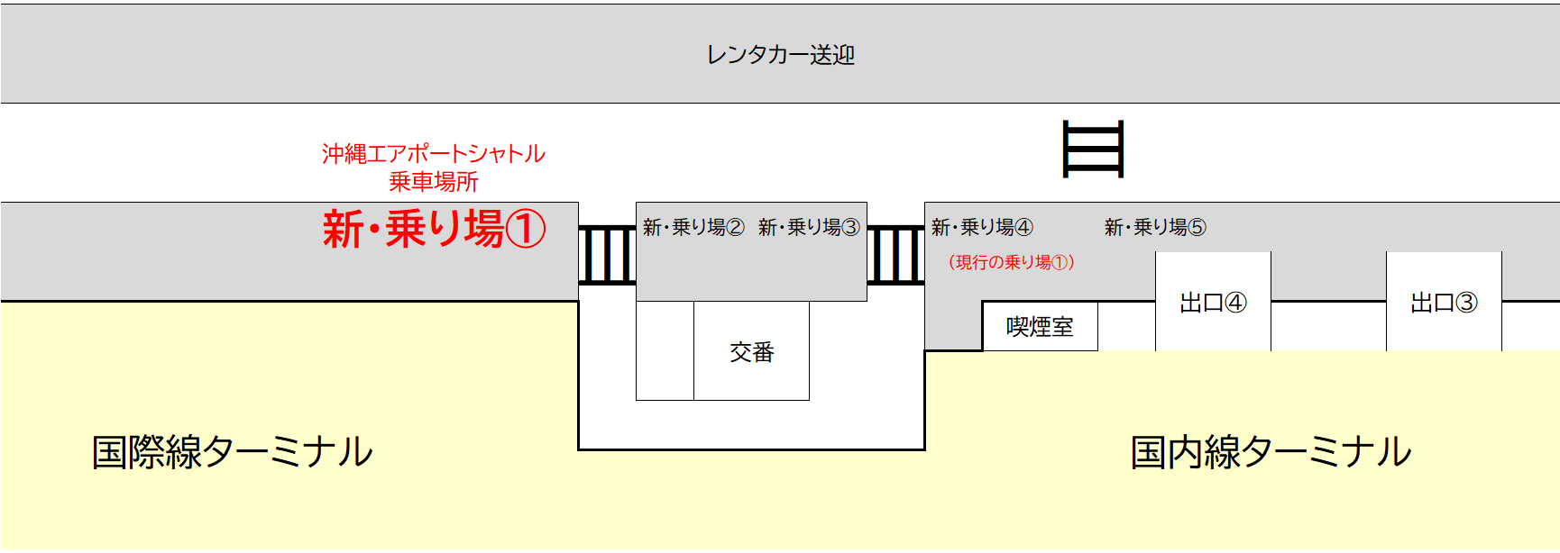 那覇空港のバス乗り場再編に伴い、「沖縄エアポートシャトル」のバス乗り場も変更いたしますので、下記の通りご案内申し上げます。